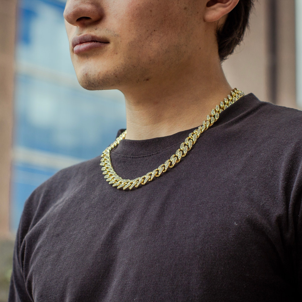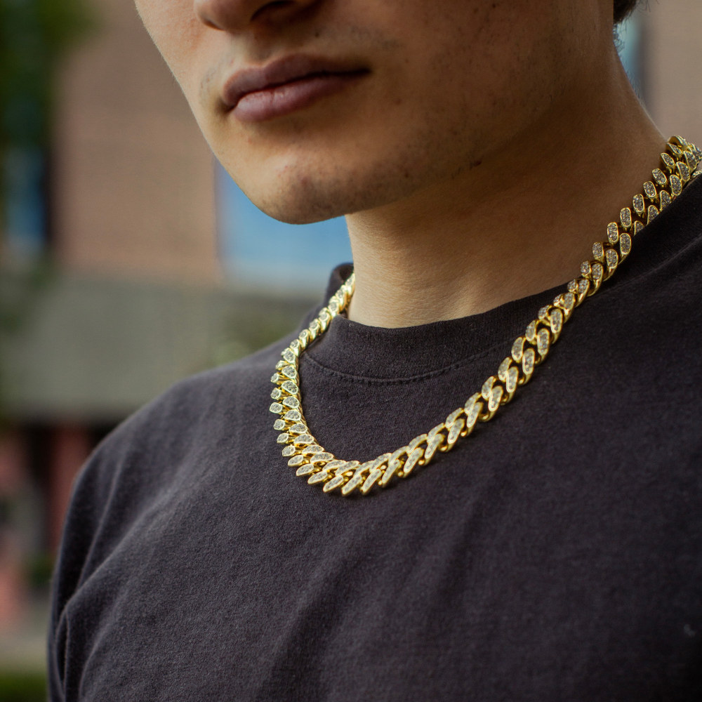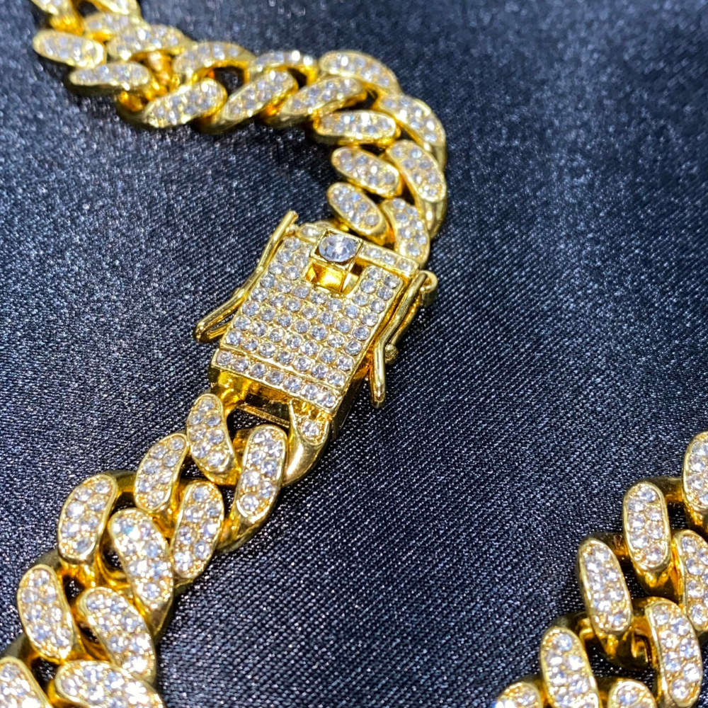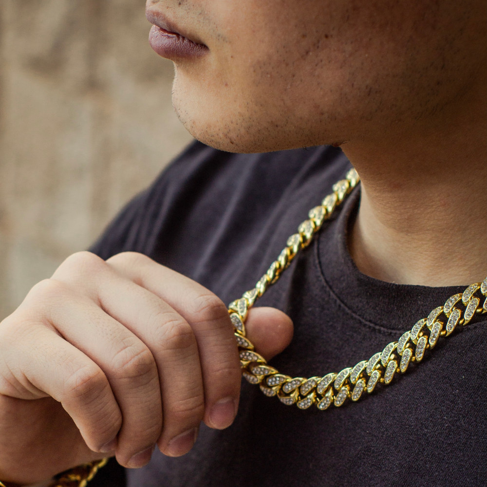 cadena corte cubano, de acero inoxidable con chapeado en oro amarillo de 18 Kilates, cuenta con incrustaciones de zirconias cúbicas calidad (AAAAA).