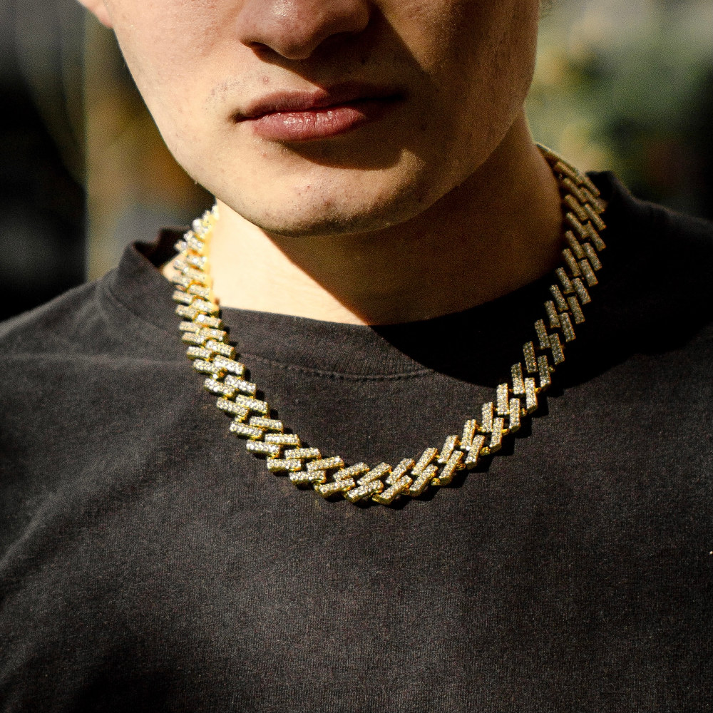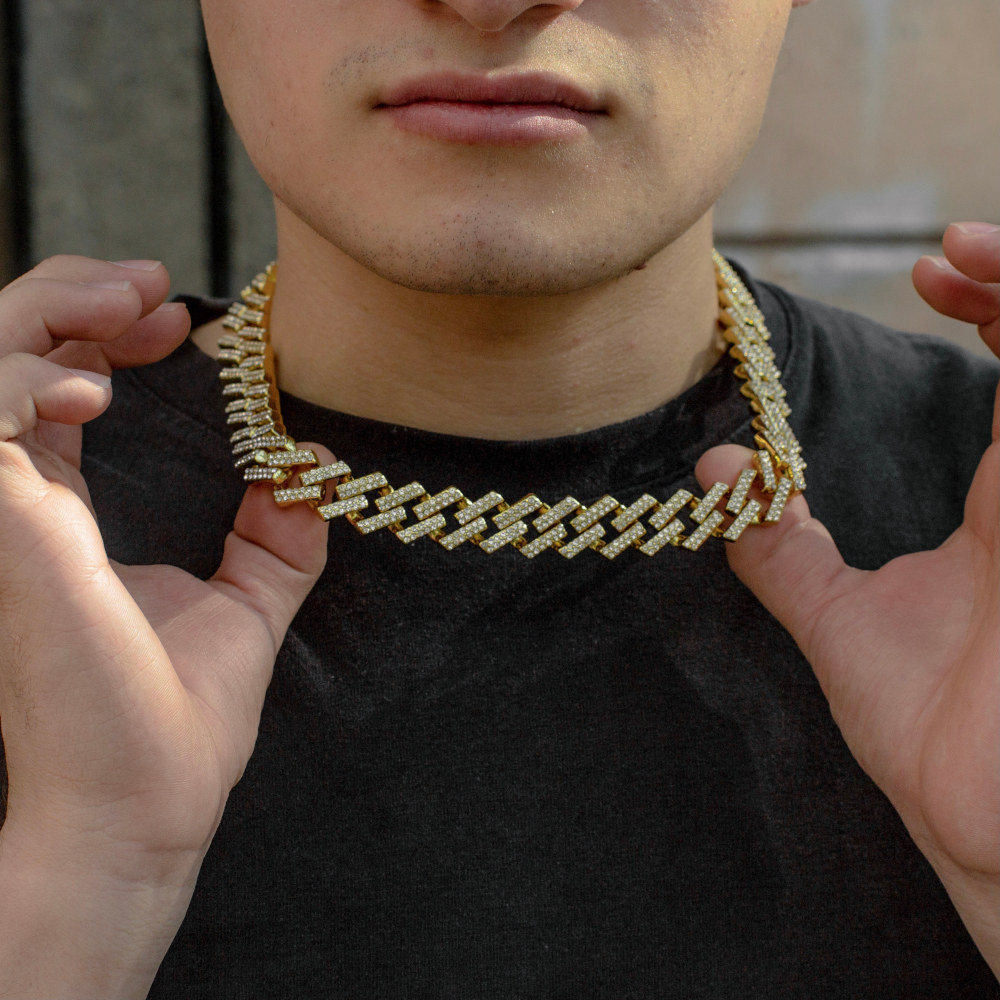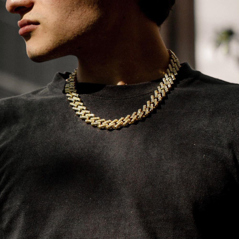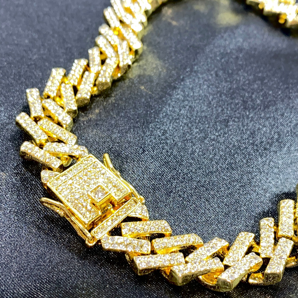 cadena corte Zig-Zag, de acero inoxidable con chapeado en oro amarillo de 18 Kilates, cuenta con incrustaciones de zirconias cúbicas calidad (AAAAA).