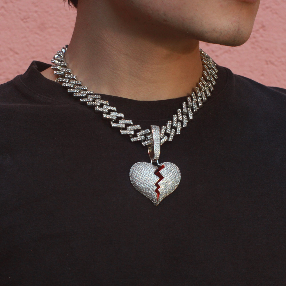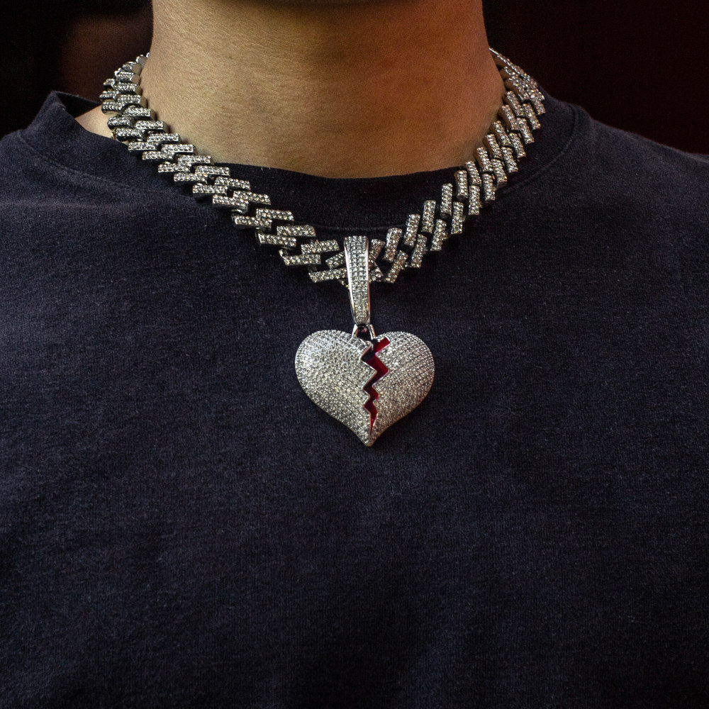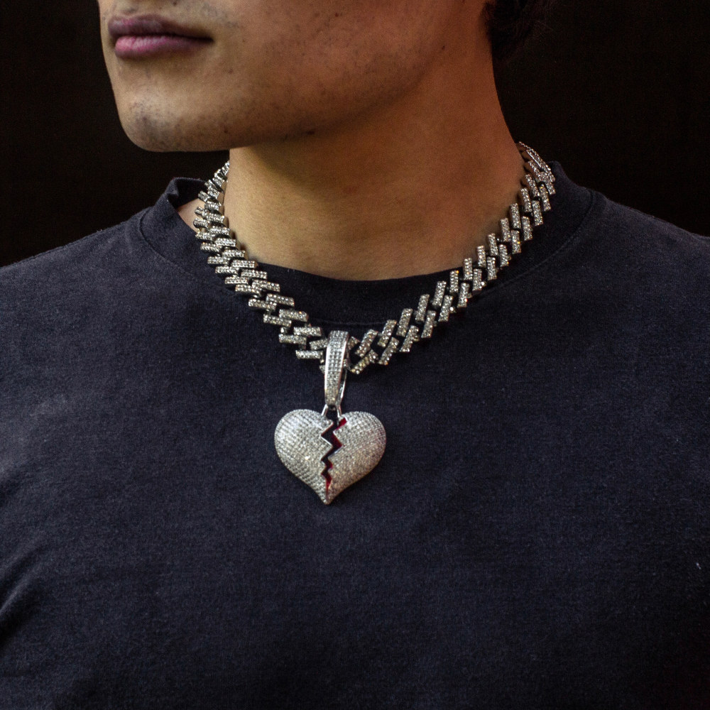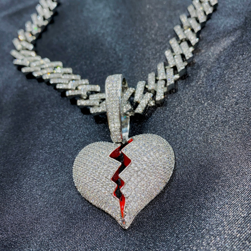 Dije de broken heart con cadena corte Zig-Zag, las dos piezas son de acero inoxidable con chapeado en oro blanco de 18 Kilates, cuentan con incrustaciones de zirconias cúbicas calidad (AAAAA).
